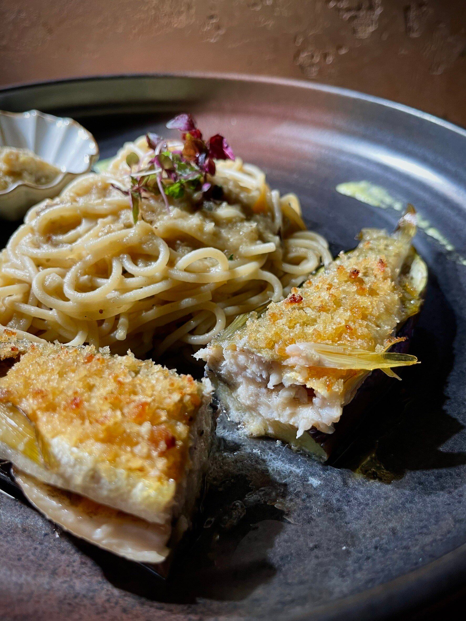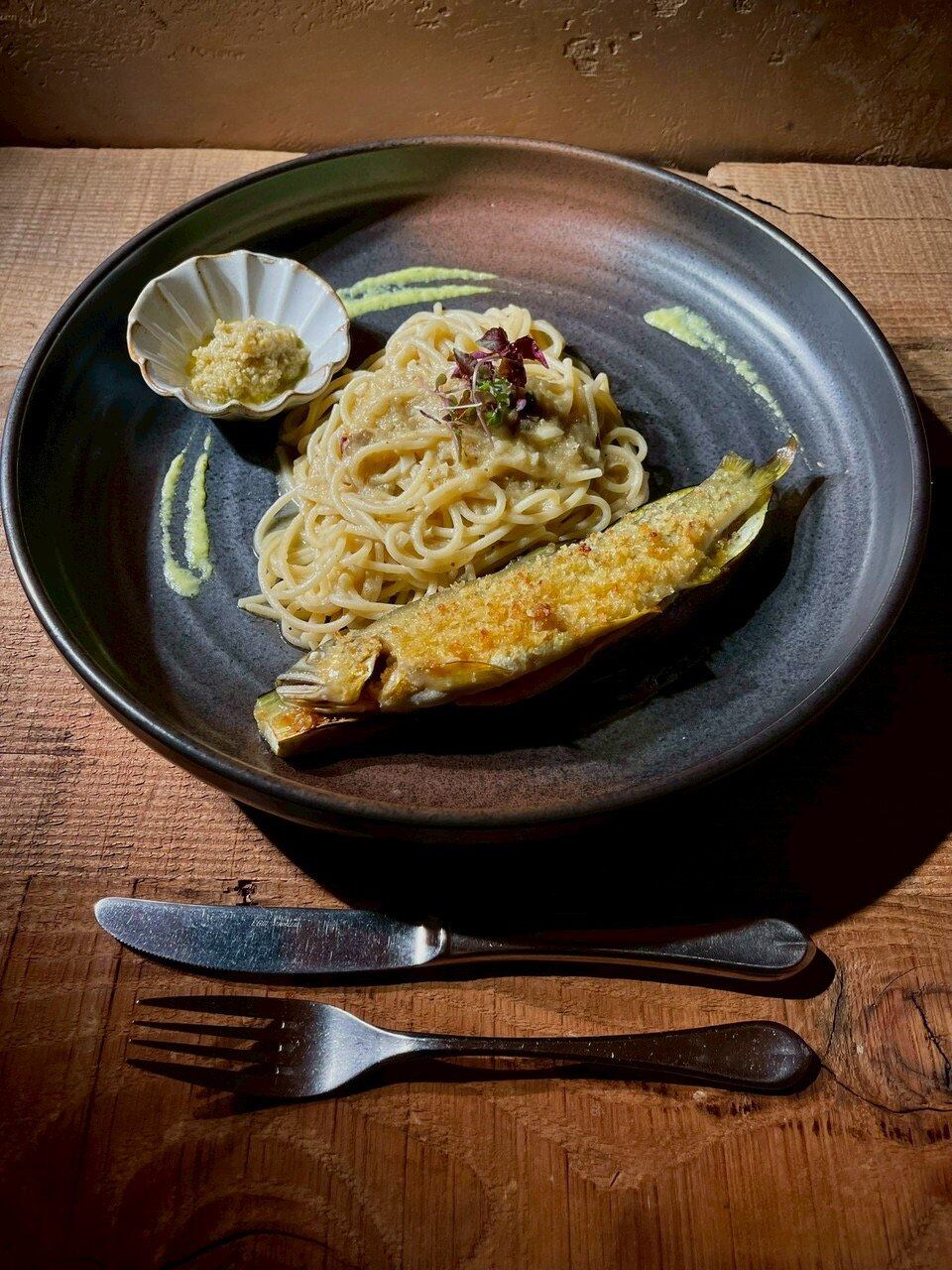 ・鮎のコンフィと濃縮した茄子ソースのスパゲッティー