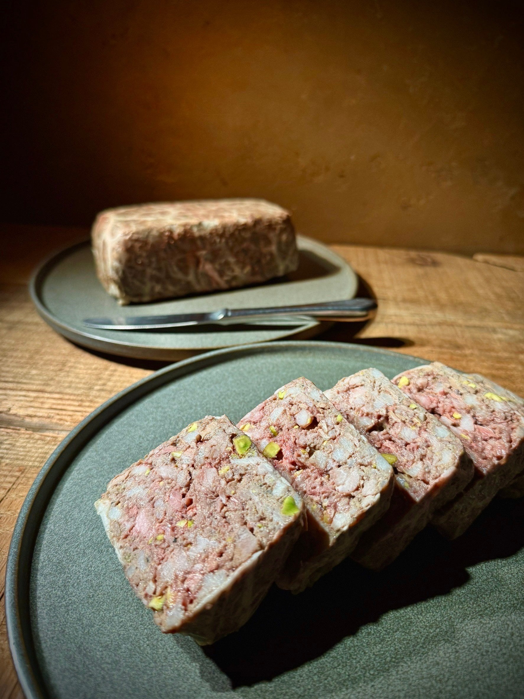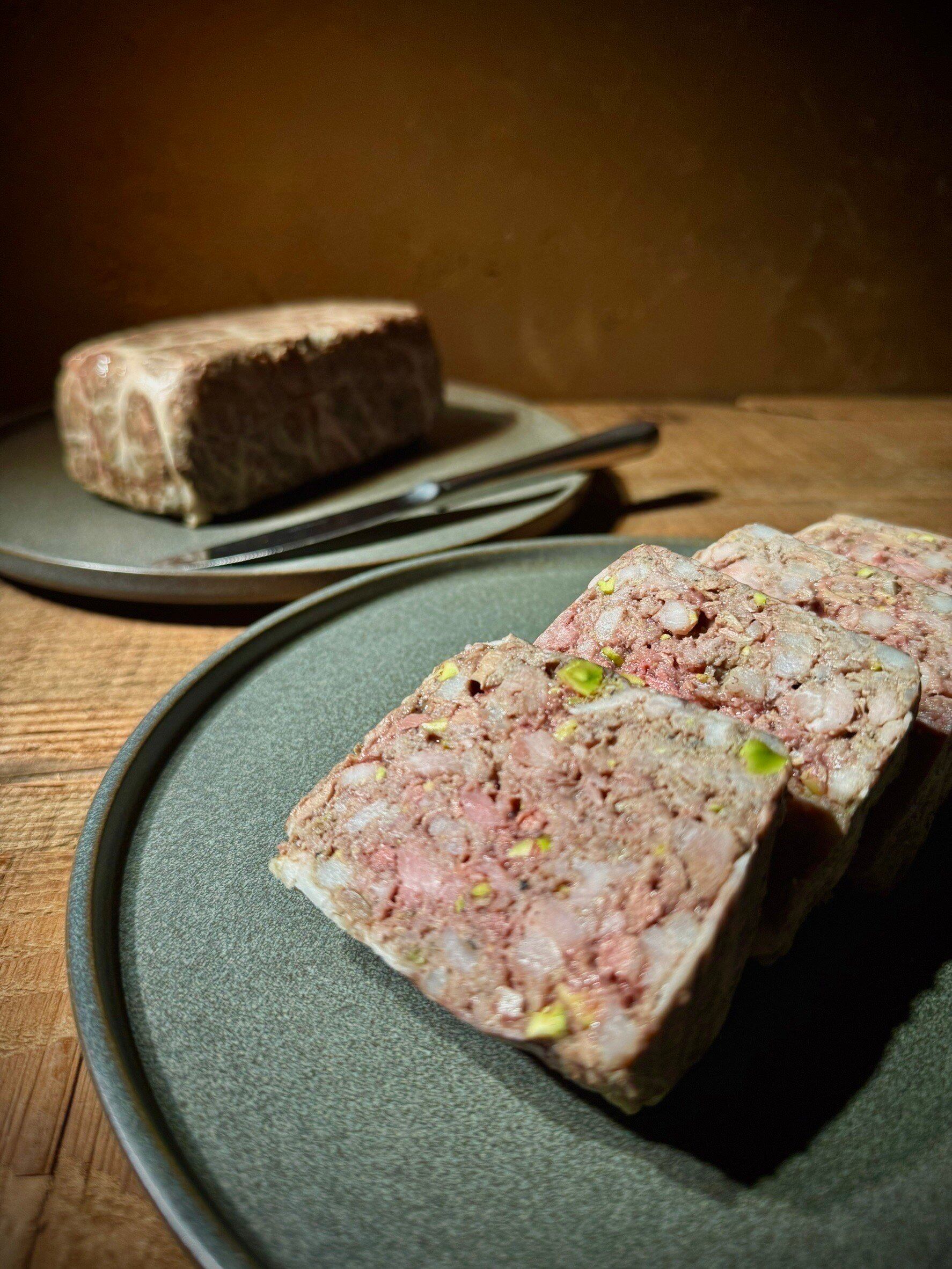 原材料:豚肉、鶏レバー、網脂、玉ねぎ、ニンニク、卵、ピスタチオ、塩、洋酒