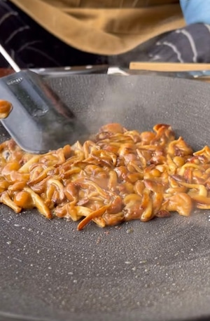 ※なめこに塩をしてオリーブオイルを引いて、しっかりと火を入れて水分を飛ばしていく(半分くらいになるまで詰める)