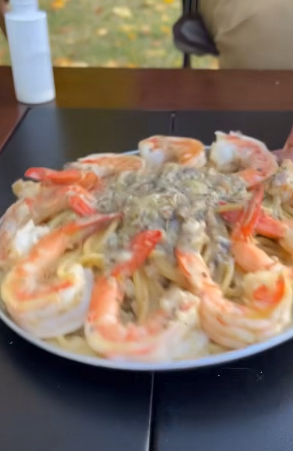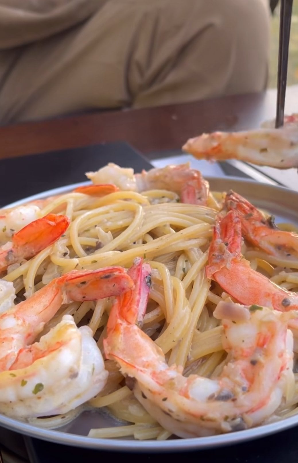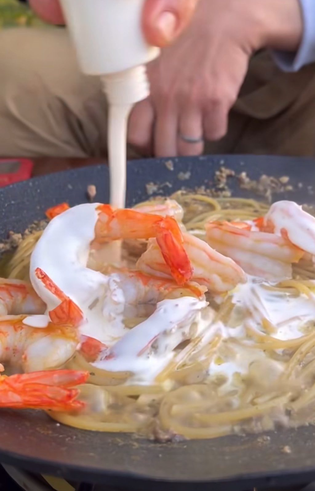 ※タイマーがなる1分前に海老をオイルごとと生クリームをいれる