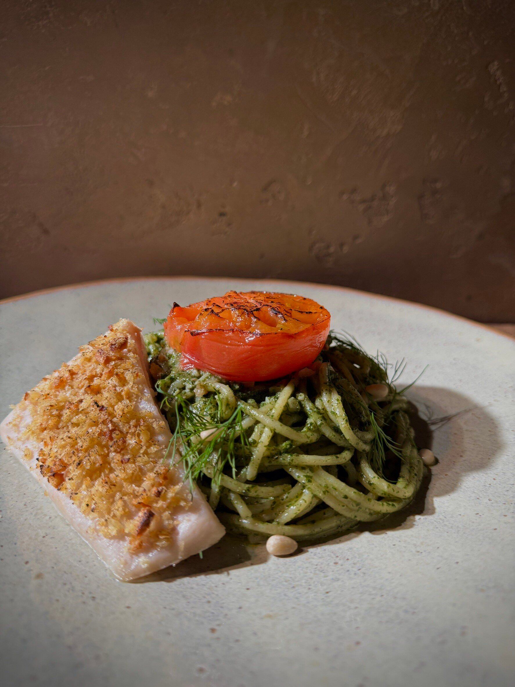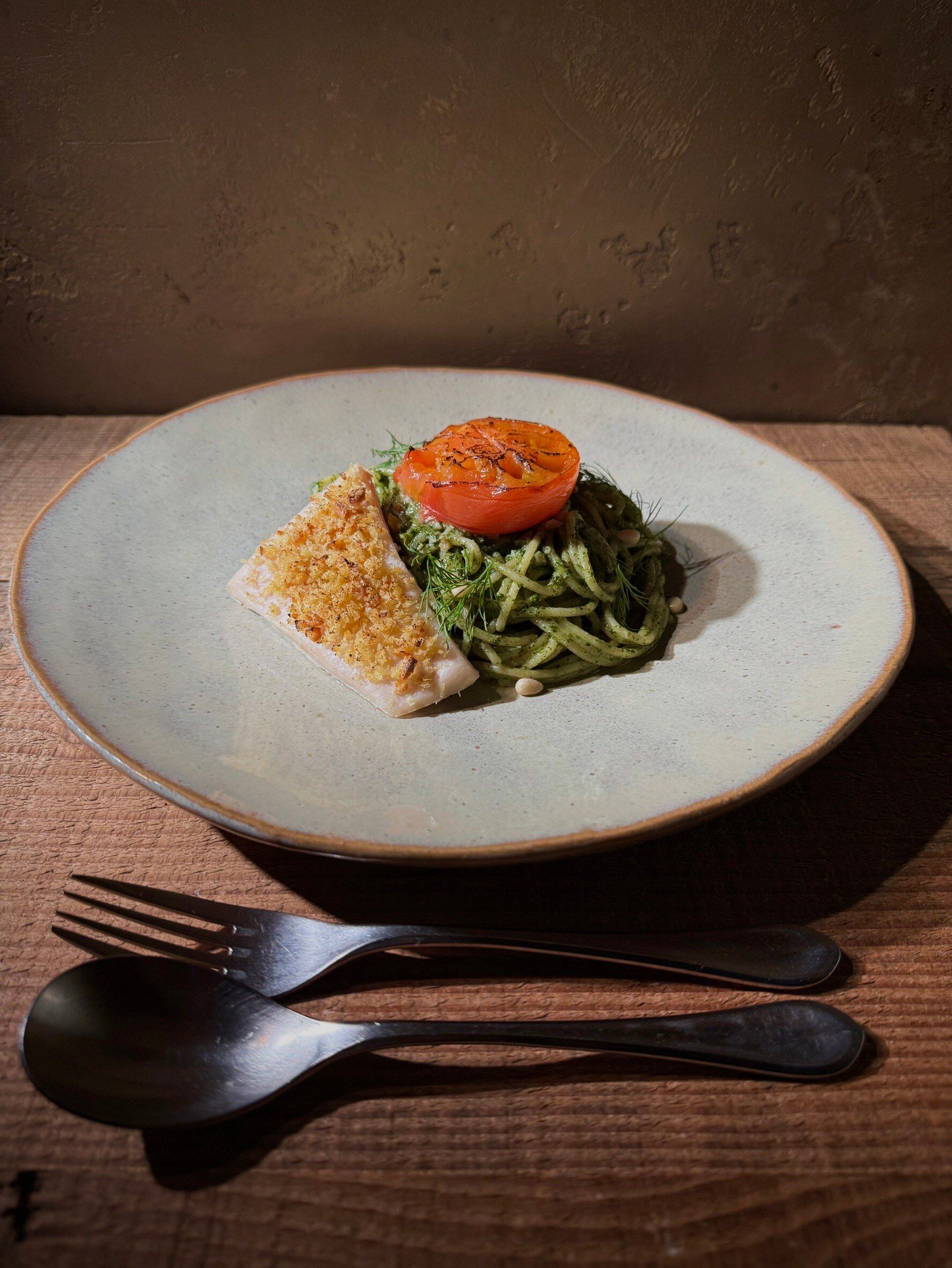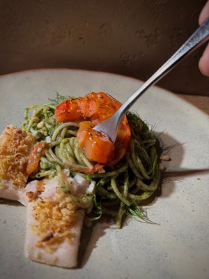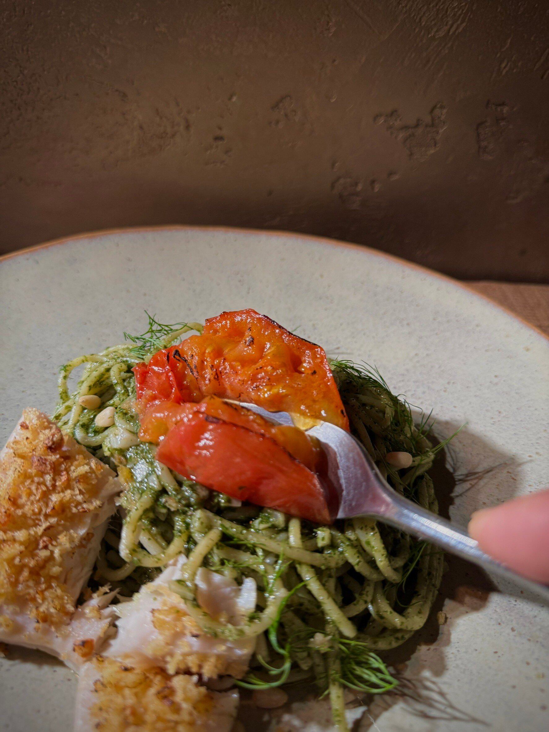 「大葉ジェノベーゼソース」はPastaクオーレ創業当初から魚介に合わせるソースとしてお出ししています。バジルと大葉、パセリを独自の配合でペーストにしています。この一皿は、オーブンで「ローストしたトマト」「コンフィしてからオーブン焼きにしたメカジキ」の組み合わせです。とろとろになったローストトマトとしっとりとしたメカジキを少しづつ崩しながら、大葉ジェノベーゼソースをたっぷりまとったパスタに絡めてお召し上がください。そうすることで、様々な味のコントラストをお楽しみいただけます。ぜひ食材と食材の相性に注目してパスタをお楽しみください。
