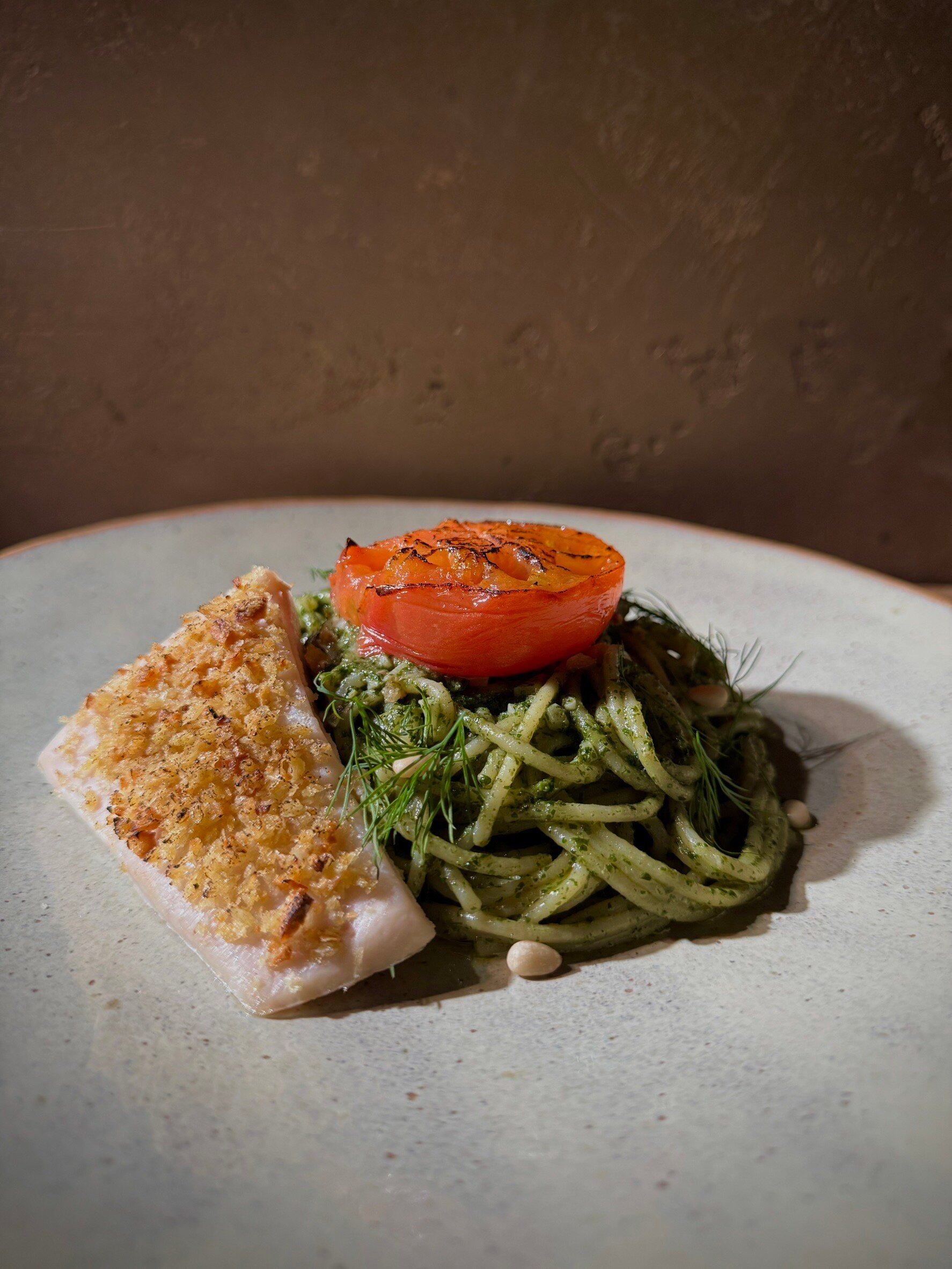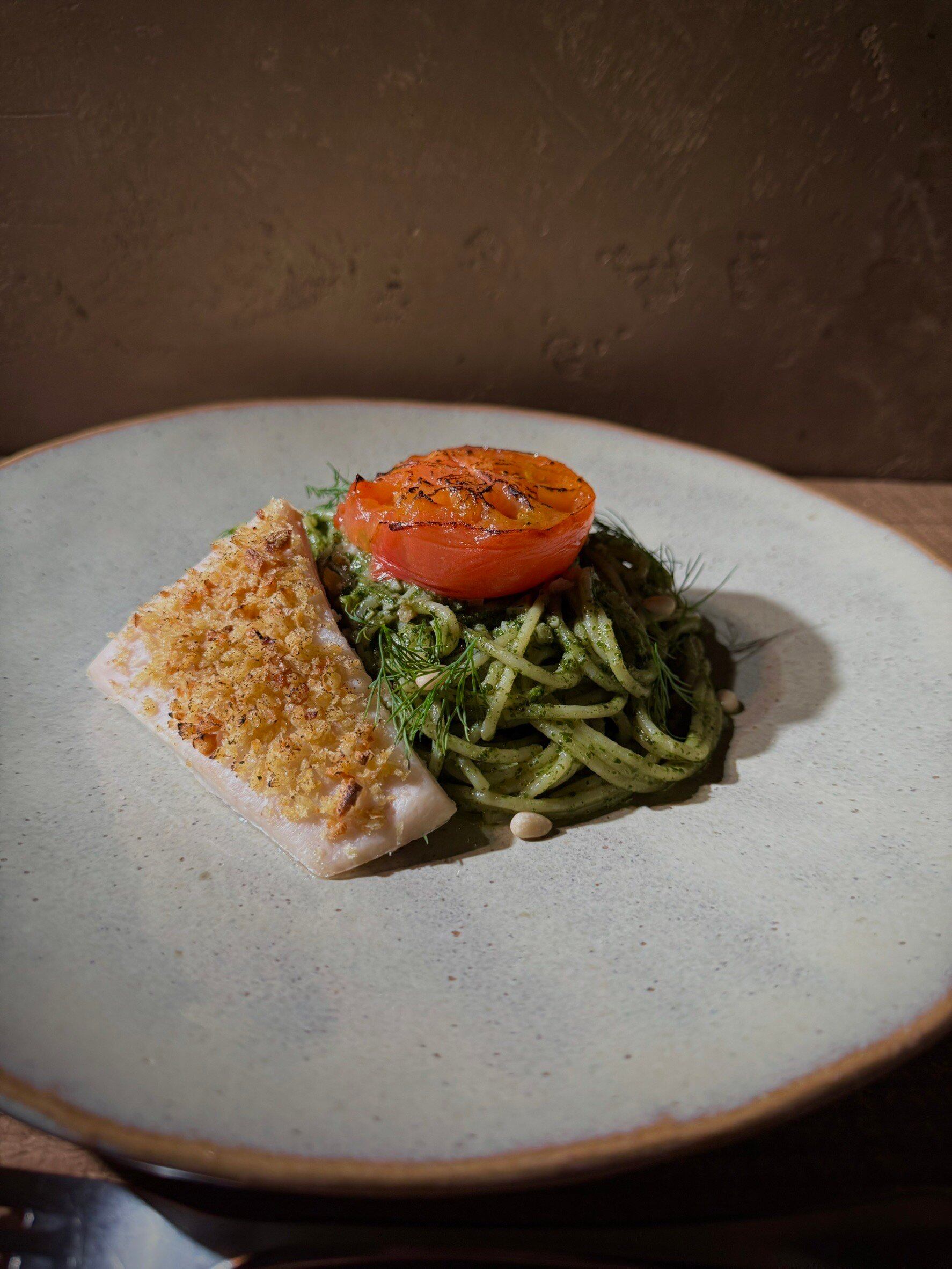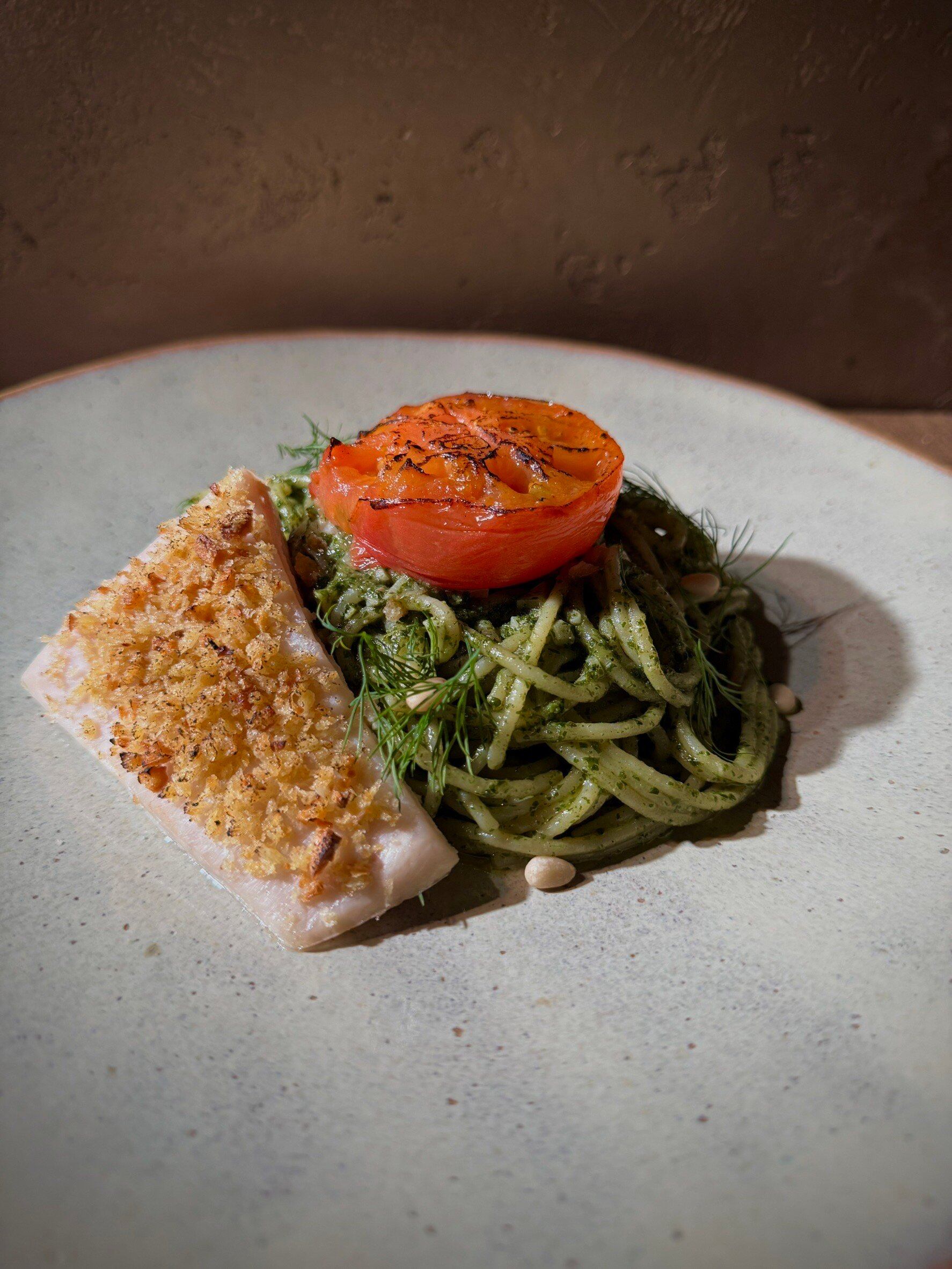 「大葉ジェノベーゼソース」はPastaクオーレ創業当初から魚介に合わせるソースとしてお出ししています。バジルと大葉、パセリを独自の配合でペーストにしています。この一皿は、オーブンで「ローストしたトマト」「コンフィしてからオーブン焼きにしたメカジキ」の組み合わせです。とろとろになったローストトマトとしっとりとしたメカジキを少しづつ崩しながら、大葉ジェノベーゼソースをたっぷりまとったパスタに絡めてお召し上がください。そうすることで、様々な味のコントラストをお楽しみいただけます。ぜひ食材と食材の相性に注目してパスタをお楽しみください。
