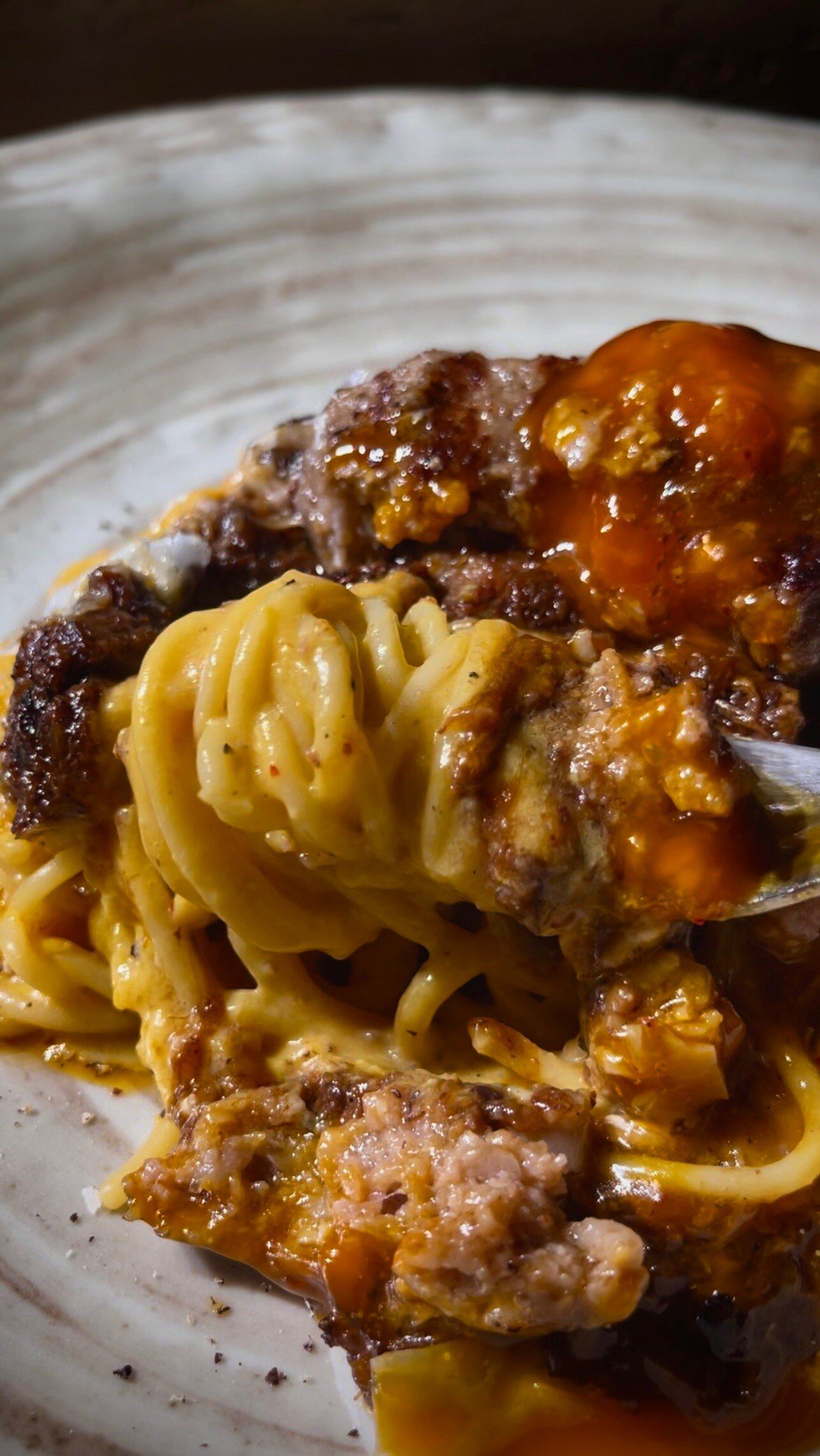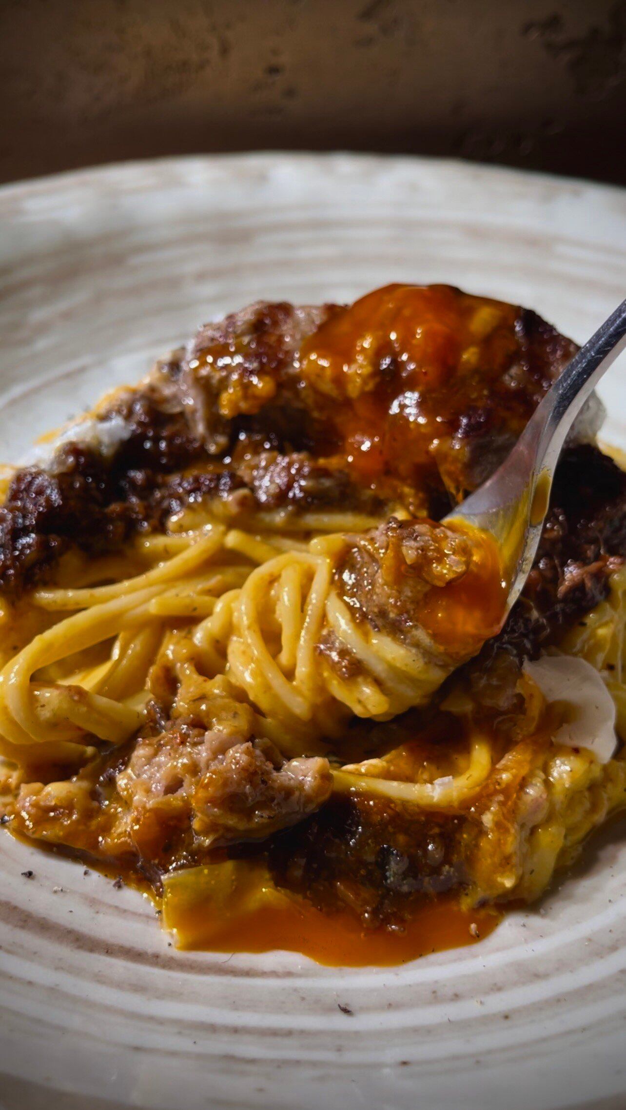 ベースのスパゲッティーはカルボナーラ。そこに、さらにミートソースをかけてしまう。という「え?!それやっちゃっていいの?!」というある意味、掟破りなパスタです。これは「ミートソースの新境地だ!」という思いを込めて「その先へ。」というネーミングにしています。このパスタを開発するにあたって一番こだわったのは、「カルボ感」と「ミート感」のバランスです。どちらかが強すぎるとぼやけてしまい、一緒にする意味がない。となってしまいます。お互いの魅力が相乗効果になる絶妙な黄金比をみつけることに力を注ぎました。