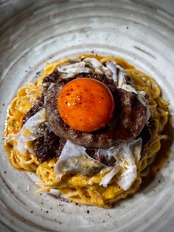 【2024年3月リニューアル】さらにインパクトがあって、みんなに愛されるパスタになるために取り入れた新たなアイデアは「炭火焼きの牛ハンバーグ」に「割下に漬け込んだ卵黄」です。そこに「ピマンデスペレット」というバスク地方に伝わる甘みのある唐辛子を合わせます。辛味を少しぶつけることによって表面的な甘みの印象が抑えられてカルボナーラが強調され重厚感のあるパスタになりました。他にも、ブラックペッペーは火の入れたものと、削ったばかりのものと「二段階にする」など細かいアイデアも取り入れてカルボナーラの存在感を強調してバランスをとっています。チーズは羊のミルクから作るペコリーノ・ロマーノを使用しています。