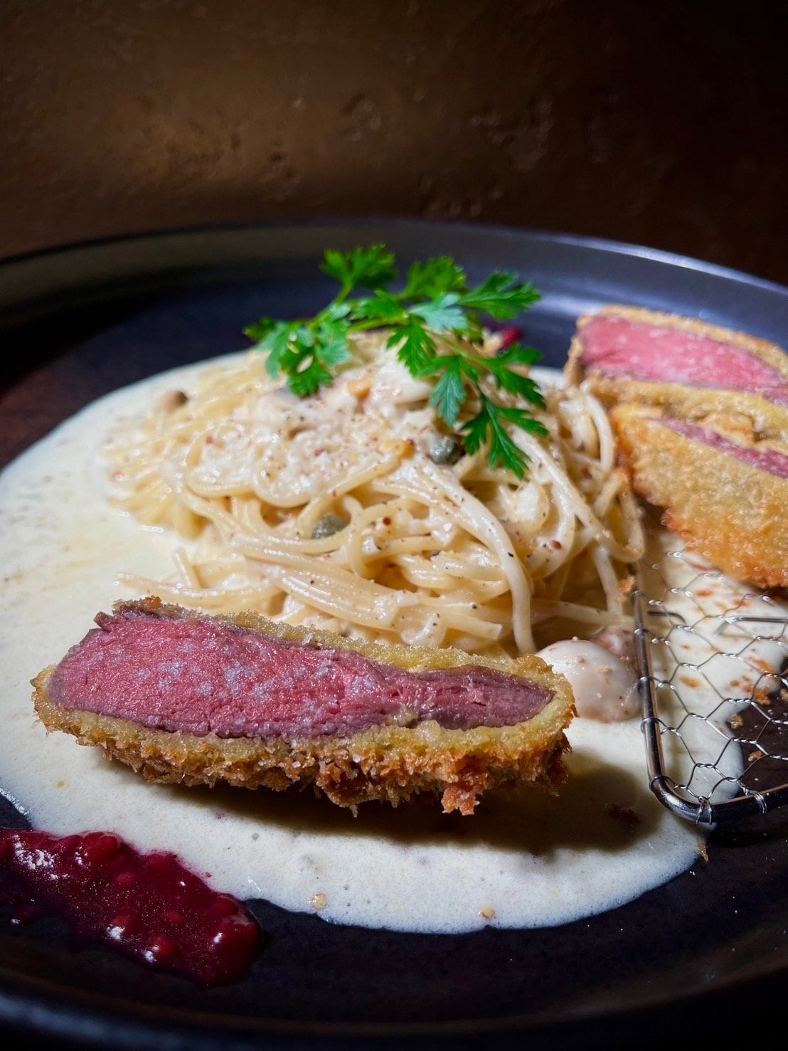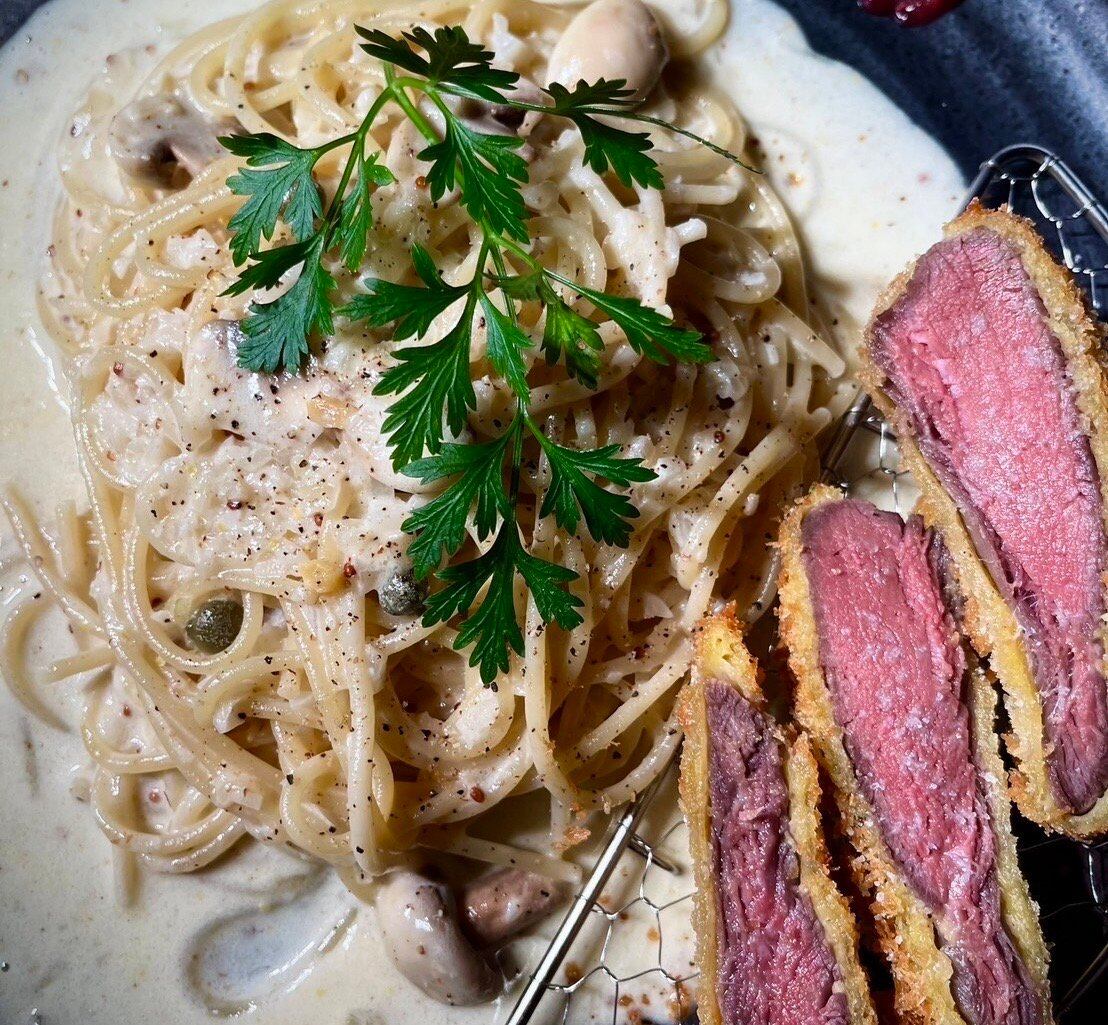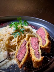 このパスタの開発のきっかけは猟師さんがやっているYouTubeでした。そこで作っていた「鹿カツ」がほんと美味しそうで「もちもちしてて、みずみずしいお肉だなぁ」という印象を持ちました。これがきっかけで「鹿カツ」というワードが頭から離れなくなって数日を過ごしていました。そんな時偶然、北海道出身の料理人仲間に会う機会があり、鹿肉の話になりました。そしたらなんと「美味しい鹿肉を仕入れられる」というではありませんか。「もうこれはやるしかない!」と開発に入りました。使用する部位は「シンタマ」(芯玉)という「内もも」と「外もも」の間にある部位で一頭から少量しかとれない希少なお肉です。脂肪がなく筋がないので、柔らかくて綺麗な赤身なのが特徴です。調理方法は、このお肉の特性を最大限活かすため「レアカツ」を選びました。まず低温調理をしてから、高音でサッと揚げます。カットした綺麗な赤身肉の断面で「鹿肉らしさ」を表現しています。この低温調理が奥が深くて「何度で何分?」の問いをひたすら考える感じなんですが、低すぎるとレアすぎてカツとして歯切れが悪くなるし、高すぎると衣がうまくつかなくてカットした時に断面が綺麗にでないんです。ここだ!というポイントをみつけるのに時間かかりました。ソースは、サワークリーム、ケッパー、パセリなどを入れた爽やかで少し酸味のあるクリームソースを合わせます。どちらかというと淡白な鹿肉にコクを加えてバランスを取るイメージです。そして「鹿肉にはベリー」と言われるほど相性が良いので、4種類のベリーと赤ワインのソースをアクセントで添えてます。豚肉にも牛肉にもない、鹿肉ならではの魅力をぜひお楽しみください。