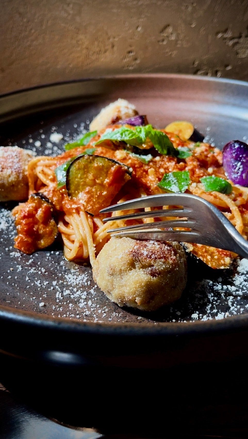 すっかりPastaクオーレの名物の一つになったこの「カリオストロシリーズ」ですが、今回はトマトソースです。このパスタの開発の始まりは、ルパンの「カリオストロの城」という映画のワンシーンでした。そこに出てくる大きなミートボールがのったパスタにインスピレーションを受けたのがきっかけです。そして映画で描かれているパスタは、トマトソースなんですよね!ですので、映画のパスタにより近いです。今回はメインのミートボールをすこし改良しました。「豚ハツ」を小さくカットして混ぜ込む事で、たまに「シャキッ」とした食感のアクセントが加わります。食欲が落ちがちな時でも最後まで美味しくお召し上がりいただけるようイメージしてレシピを考えました。ミートボールの火の入れ方は、最初にオーブンで焼いた後、表面をローストし、最後に炭火で香ばしい香りをつけながら仕上げていきます。表面にセモリナ粉を纏わせて火入れすることで、最初ほんのりガリッとしてて、中はフワッとしてる食感をイメージしています。トマトソースに合わせる食材には、まず「茄子」です。素揚げしてからトマトソースと馴染ませます。そしてそこに「バジル」の香りを合わせます。今シーズンはここに「清涼感」を少し加えたくて、刻んだミントを少しだけ仕上げに盛り付けています。バジルの甘い香りと、茄子、トマトソースの組み合わせは王道です。でも王道という事は、長い時間かけて人が辿り着いた、体が求める「美味しさ」とも言えると思っています。ぜひ、このパスタをお楽しみください!
