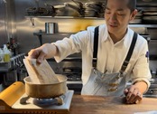 ひき肉で作らないミートソースです。「塊の和牛スネ肉」を炭火で焼いてからホロホロになるまで煮込みます。ソースの味は「仔牛の骨」から出汁を取るところから完全に手作りです。化学調味料、既製品は使用していません。まず「自家製のデミグラスソース」にして、そこから独自の調合でミートソースにしていきます。作り始めてから出来上がるまでに「丸6日」かかります。そして、このミートソースはお皿に盛りつけた時はまだ完成していません。今から召し上がっていただくあなた様と一緒にミートソースを仕上げていきます。というのも「ミートソース」というものを突き詰めて考えた時、「何段階にも肉の美味しさを感じる」ことこそが本当に美味しいミートソースだと僕たちは定義しています。その仕上げとして、パスタの真ん中に「炭火」で焼いた「牛ハンバーグ」をご用意しています。思い切ってスプーンとフォークで崩してください。これが仕上げです。ある意味、牛ハンバーグは調味料に近いポジションかもしれません。あとはしっかりとパスタとミートソースと絡めながらお召し上がりください。「牛骨からとる出汁」「ほろほろに煮込んだお肉」「炭の香りのする牛ハンバーグ」により、お肉の美味しさを何段階にも味わっていただけるミートスパゲッティーが完成しました。