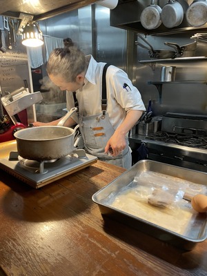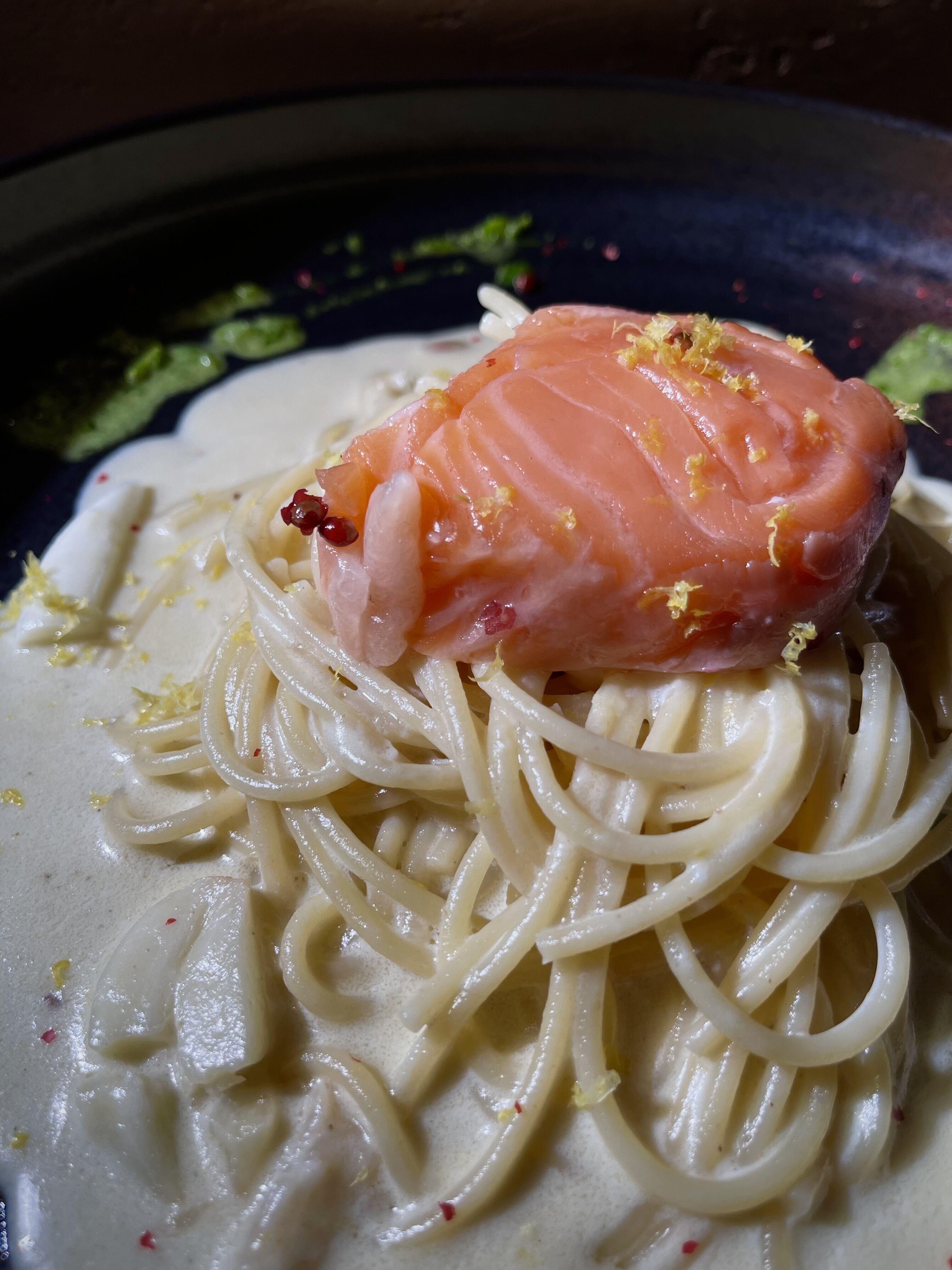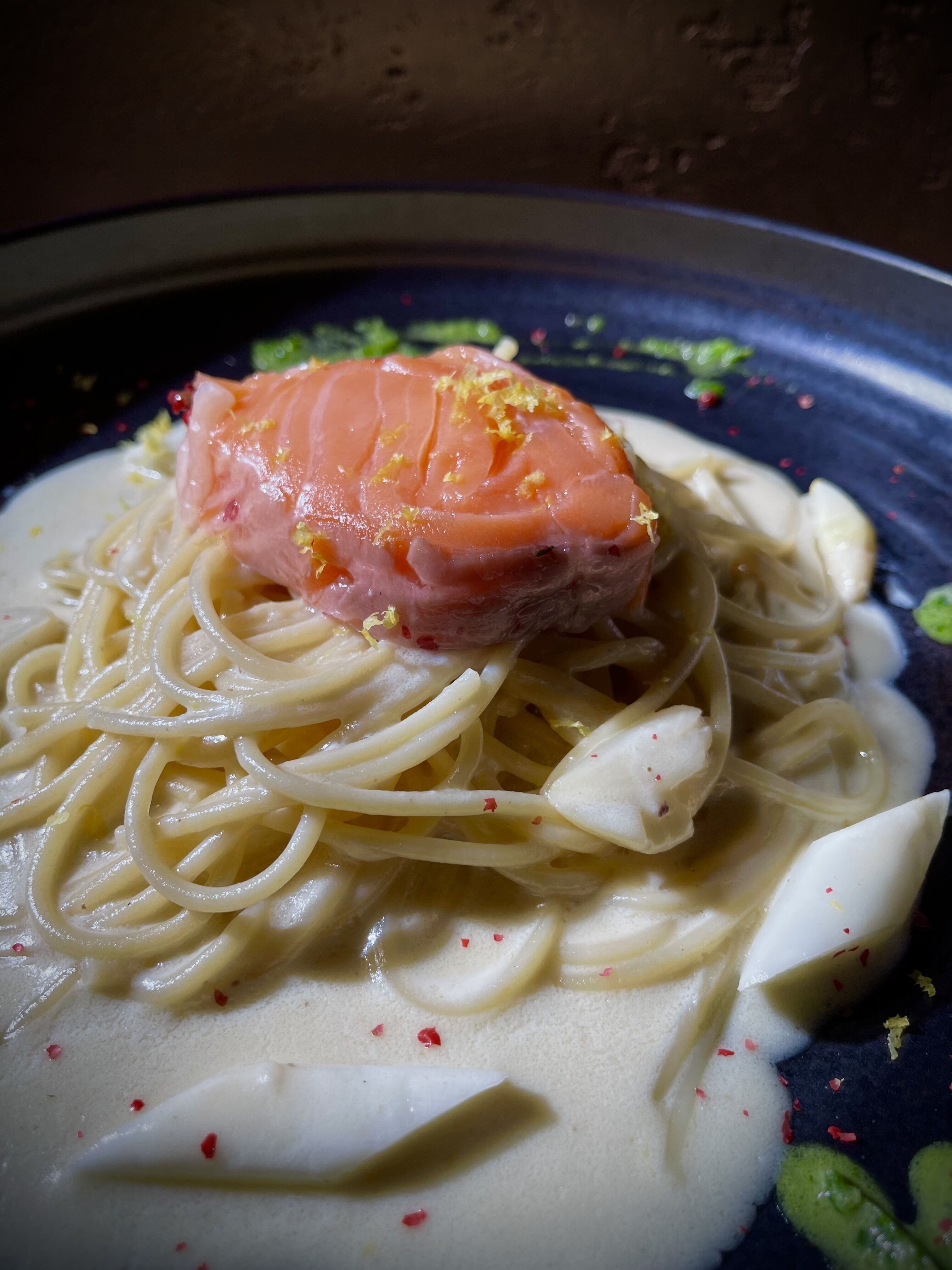 このお店を開業してから18年ほどが経ちました。そこで気づいたんです。「ある食材」にだけ手を出してないことを。そう、それが「サーモン」です。正直、王道すぎて盲点でした。常に新しい挑戦を求め続けるPastaクオーレがこのパスタで目指したのは「飲めるほどに、とろとろ」「ギリギリの低音火入れのサーモン」を主役にしたパスタです。フランス料理では「ミキュイ」や「コンフィ」と呼ばれる調理法ですが、つまり「生にみえるけど、火が通っている」状態のことです。これまでにはなかった新感覚のサーモンのパスタ。新たな風味の発見と驚き。これをもし、お客様に体感していただくことができたら?それを考えるとワクワクが止まりませんでした。そんな湧き上がる情熱と共に開発がスタートしました。なんといっても一番の難関は、サーモンの火入れのベストなポイントを見つける作業でした。味は「生のサーモン」の美味しさを表現したい。でも「崩れるほどのホロホロ感」を実現するには、「焼いたサーモン」のフレーバーが出ないギリギリまで火入れを攻めなくてはいけません。この2つの要素を両立させるポイント。ここを見つけることに全精力を注ぎました。その他の構成として後半で味をガラッと変える存在として「ディルと春菊のペースト」です。このペーストは、レモンクリームと合わさった時に花が開くというか、そこを想定して配合を考えました。この絶妙なバランスが、一皿の深みと広がりを生み出します。ここにも是非注目して楽しんでいただきたいです。それでは、「生っぽいけど生じゃない」サーモンの持つ独特の美味しさを、全身で感じていただけることを願っています。