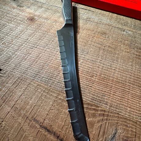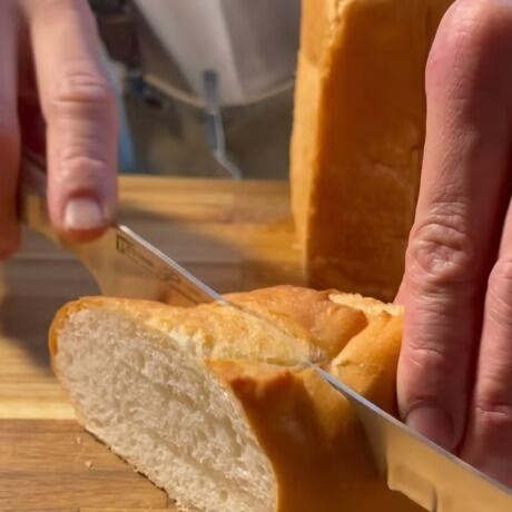 特殊形状刃は、焼きたてのパンやトマトなど外が硬く中がやわらかい食材を、驚くほど綺麗にストレスなく切る事ができます。ノコギリのように前後に動かして使ってみてください。